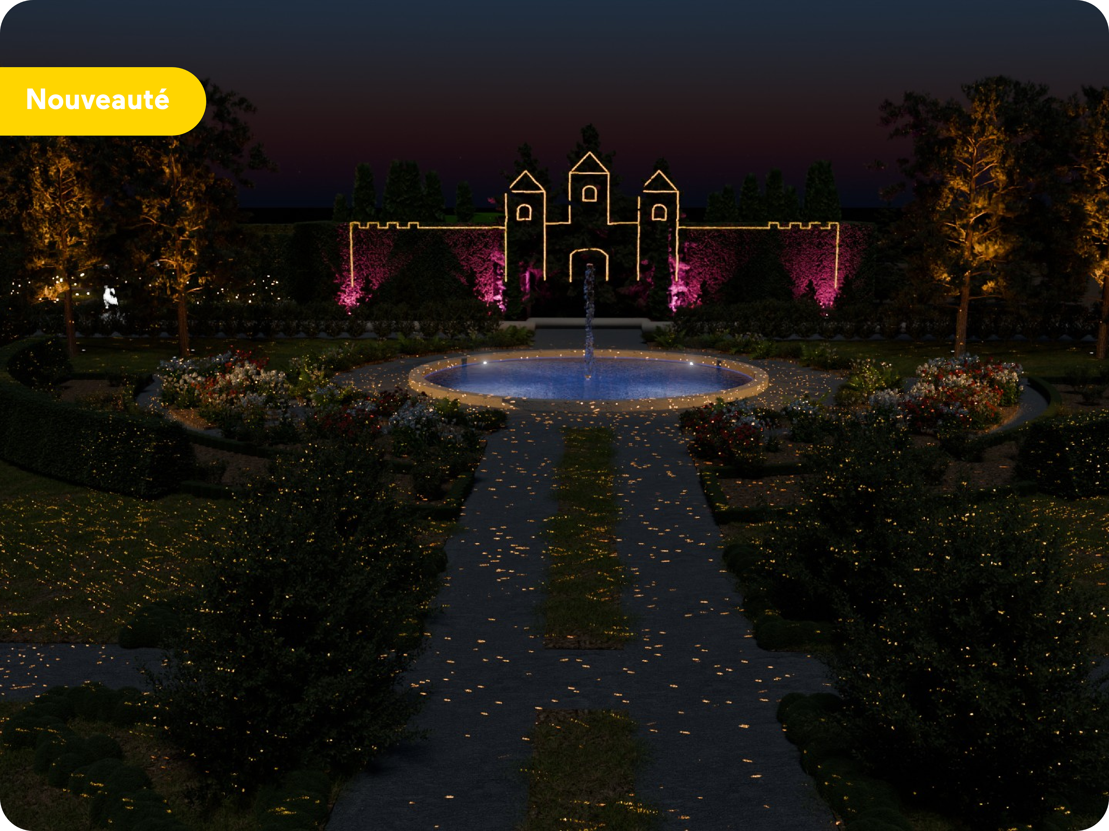 Plusieurs stations illuminées, inspirées par les thèmes de la lumière et de la royauté, jalonnent le parcours et créent des atmosphères distinctes. À la Place du Maire, un spectacle son et lumière souligne la rencontre des jardins français et anglais. Des bornes interactives permettent également d’explorer l’histoire des jardins royaux, incluant un conte destiné aux enfants.